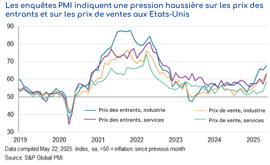 A ce jour, les chiffres de dépenses du mois d’avril – premier mois de hausse des droits de douane – suggèrent une économie de la consommation toujours forte, avec une inflation maîtrisée. Au mois de mai, les chiffres hebdomadaires de demandes d’indemnités chômage, ainsi que les ventes dans les grands magasins (indicateur « Johnson Redbook ») ne suggèrent pas encore de rupture avec les mois précédents. La livraison du mois de mai des enquêtes PMI de S&P Global auprès des directeurs d‘achat semble cependant laisser planer peu de doute sur la tendance à venir : une hausse des prix est bien dans le tuyau, avec une pression à la fois dans l’industrie et dans les services (graphique 2). A noter que ces données d’enquêtes sont qualitatives, et non quantitatives. Elles ne disent donc rien de précis sur le niveau d’inflation à attendre.