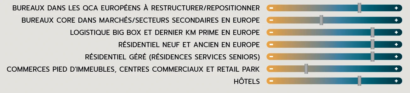 Les segments logistique et résidentiel nous semblent offrir les meilleures perspectives, portés par des tendances structurelles garantes d’une demande résiliente. Les bureaux prime à restructurer et les hôtels présentent, quant à eux, un fort potentiel de création de valeur. Les bureaux accessibles, situés en proche périphérie des grandes villes, ont connu un important ajustement de prix, tant par la baisse des loyers que la décompression des taux de rendement. Ils nous apparaissent donc désormais attractifs, dès lors qu’ils sont adaptés aux nouveaux usages, bénéficient d’un label ESG performant et assurent un revenu locatif sécurisé à long terme.