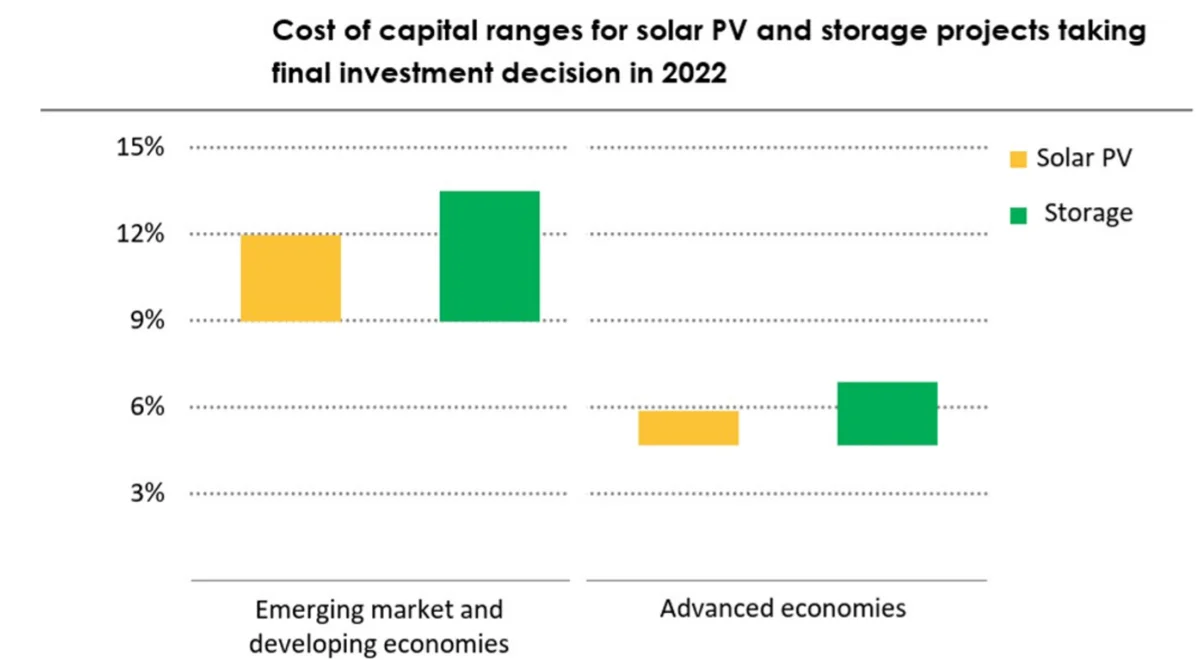 A titre d’exemple, si nous prenons un projet d’énergie solaire, ce coût peut être jusqu’à deux fois plus élevé que dans les pays développés pour un projet équivalent. A noter que le coût de capital d’un projet solaire est principalement porté par la dette (65% en moyenne).