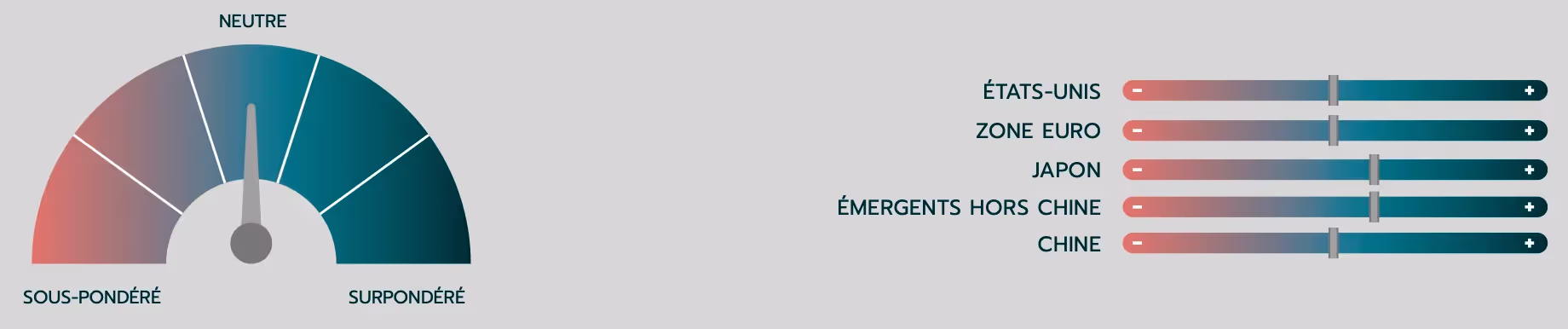 Les marchés actions ont connu un accès de faiblesse sur fond d’inquiétudes sur les taux courts et de tensions géopolitiques, propices à l’encaissement d’une partie des positions de convexité que nous évoquions le mois dernier. Néanmoins, la baisse ne nous apparaît pas suffisamment ample pour mériter un passage en surpondération ferme au vu des incertitudes encore présentes. Nous maintenons donc notre vue neutre autour des niveaux actuels avec une approche opportuniste contrariante en fonction de la volatilité des marchés.