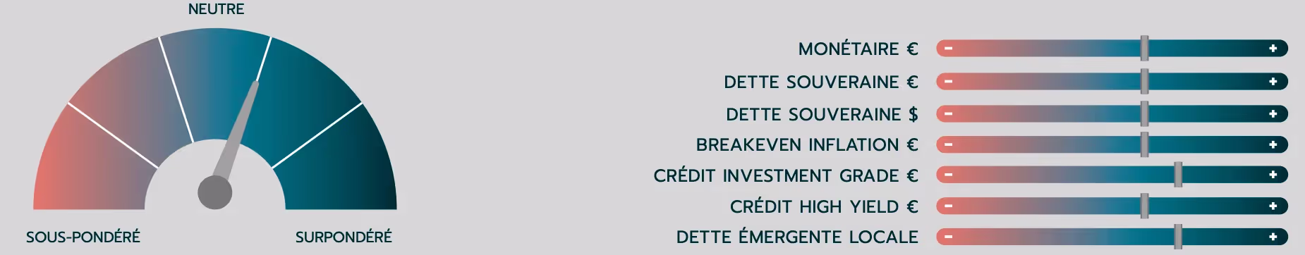 Sur le marché obligataire, nous maintenons notre biais positif sur la duration sur les niveaux actuels, toute tension pouvant être mise à profit pour allonger la position comme à la fin du mois dernier. Nous restons également exposés à la pentification des courbes compte tenu de nos attentes des premiers mouvements des banquiers centraux.