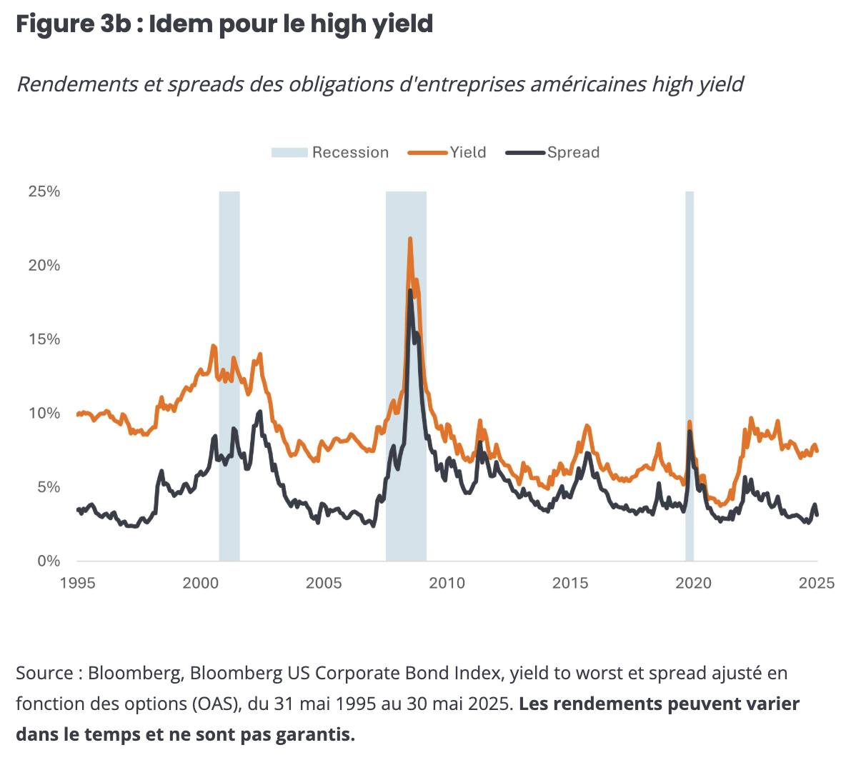 Les spreads de crédit (le rendement supplémentaire qu'offre une obligation d'entreprise par rapport à une obligation d'État de maturité similaire) se sont élargis pendant la panique tarifaire d'avril, mais ont rebroussé chemin depuis. Les spreads sont relativement bas au regard du passé et, à l'instar des marchés actions, n’intègrent pas une récession (figures 3a, 3b).