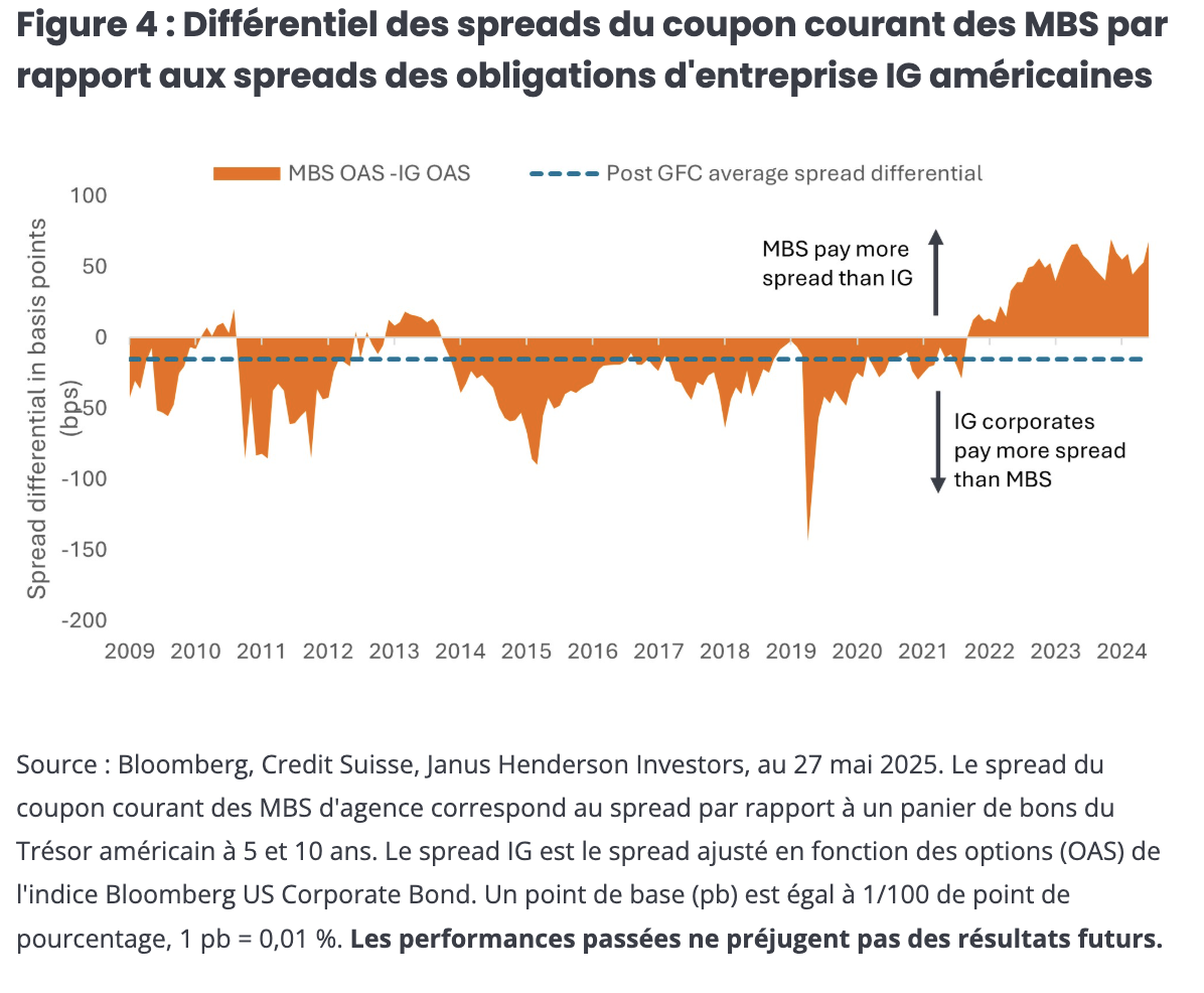 Ces dernières années, la hausse des taux d’intérêt et le resserrement quantitatif ont pesé sur les MBS, conduisant à une situation anormale où les spreads sont plus élevés que ceux des obligations d’entreprise américaines investment grade (IG). Avec la perspective de la fin du quantitative easing (QE) et de nouvelles baisses de taux, nous voyons cette anomalie de spread se résorber, faisant des niveaux actuels un point d’entrée potentiellement attractif (figure 4).