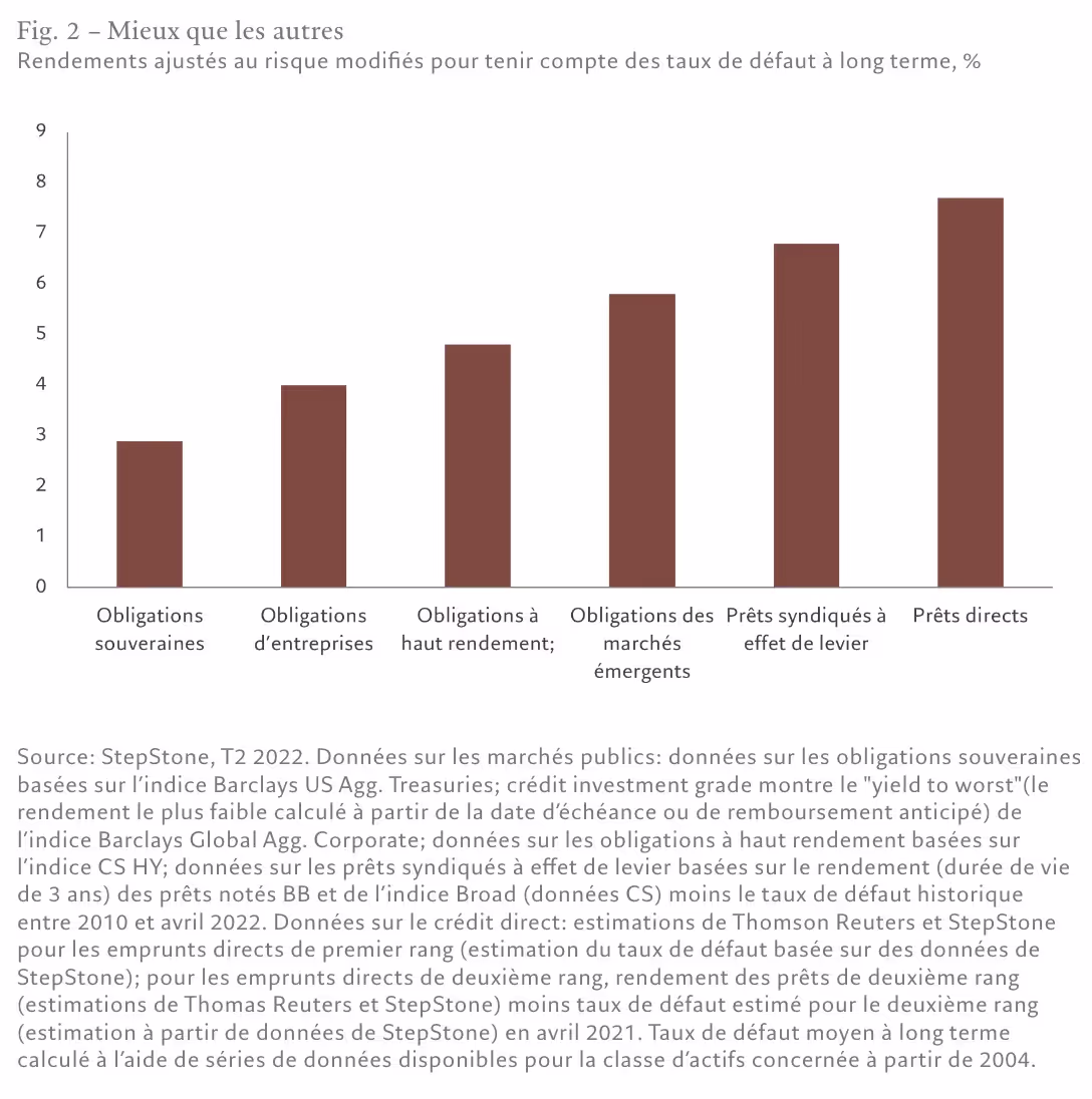 De 2010 à 2022, les prêts directs ont généré des performances annuelles moyennes de 10 %, contre 4 % pour la dette à haut rendement et 3,2 % pour les prêts à effet de levier, a constaté la banque d'investissement. De plus, comme leurs avoirs sont immobilisés sur des périodes plus longues, les investisseurs sont moins exposés à la pression psychologique que leur font subir les réévaluations incessantes sur les marchés. Ils sont protégés contre une des principales causes de sous-performance: vendre à bas prix. Ils peuvent également bénéficier de clauses de protection des prêteurs plus strictes que celles que l’on observe généralement sur les marchés publics, où la syndication des prêts entre plusieurs investisseurs favorise souvent une approche fondée sur le plus petit dénominateur commun en matière de protection des investisseurs.