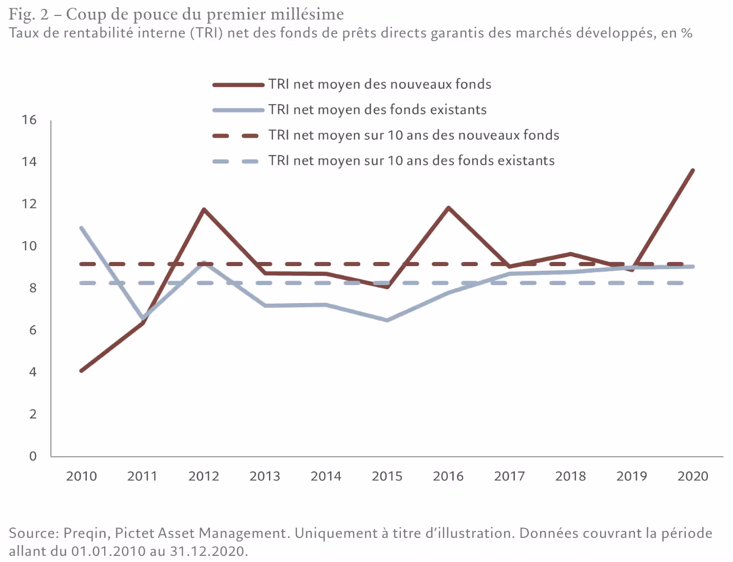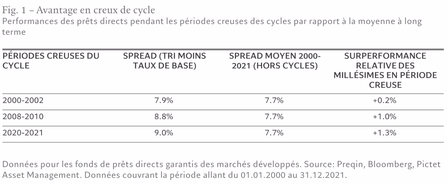 Une analyse des performances d’investissement sur les cycles conjoncturels des 20 dernières années vient soutenir notre thèse. Les stratégies de prêt direct lancées en période de difficultés économiques – on parle de millésimes de creux de cycle – génèrent des performances supérieures à la moyenne (voir Fig. 1).