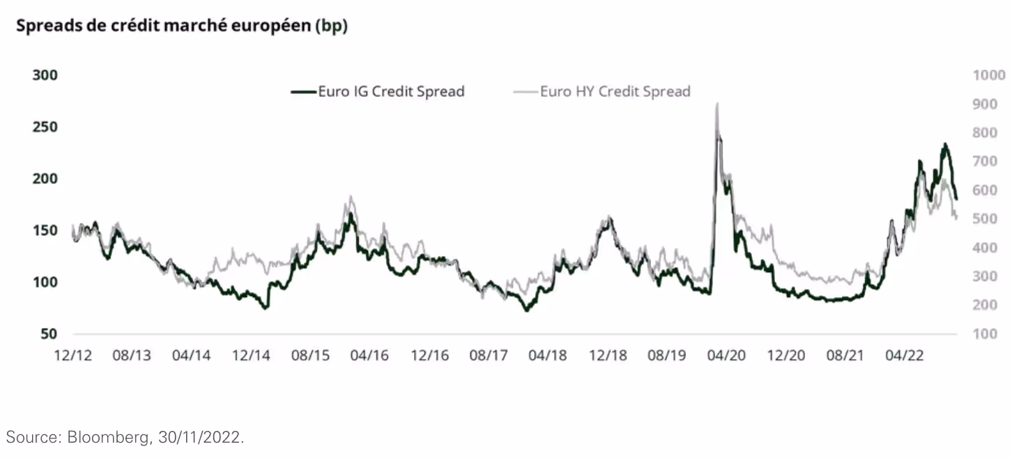 Les marchés obligataires internationaux ont subi des pertes historiques en première partie d’année, mais c’est ce qui a rendu les valorisations actuelles extrêmement attractives, plus particulièrement sur le marché du crédit, où les spreads ont atteint des niveaux historiques :